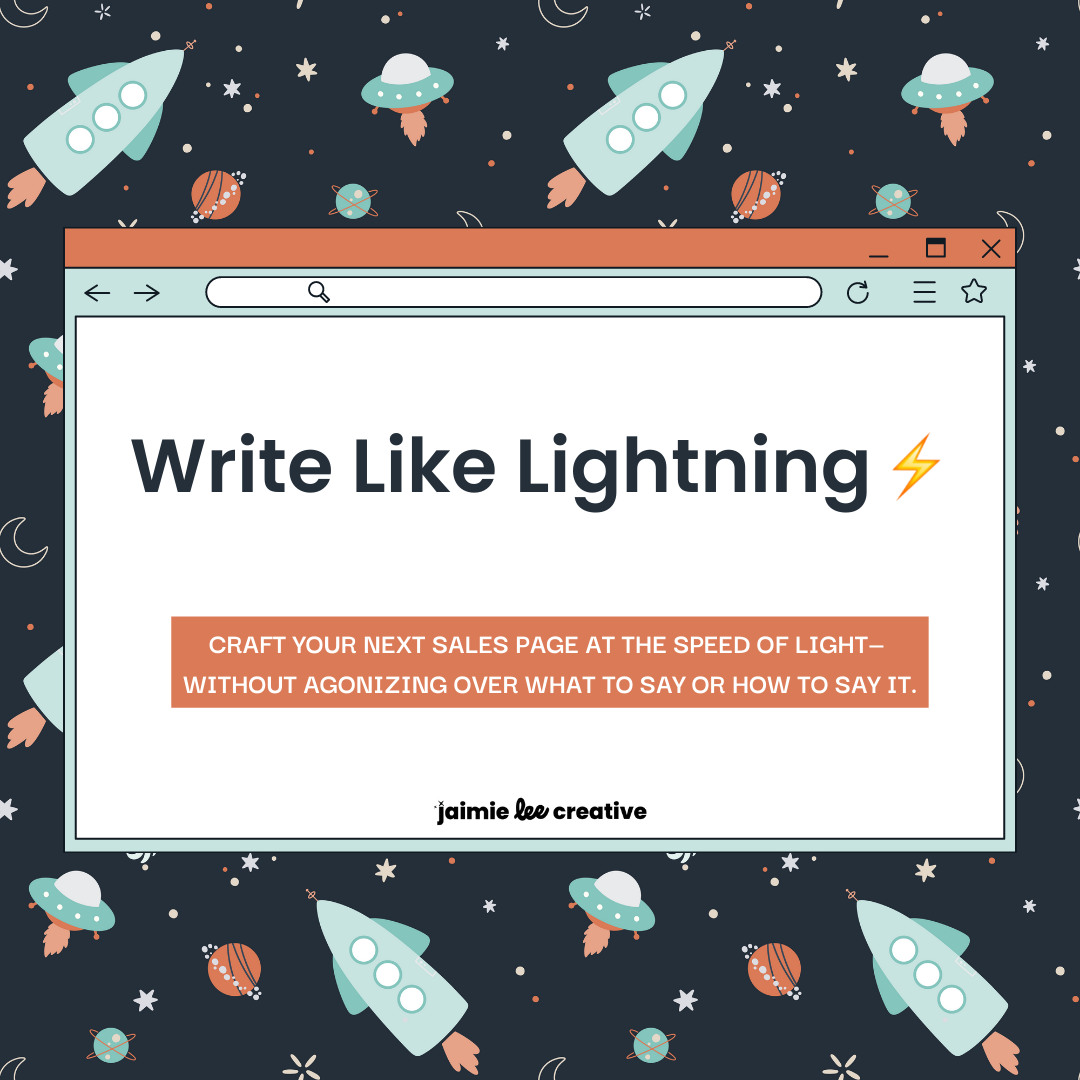 WHAT'S INCLUDED: ⚡Short, bite-sized videos to guide you through each section of a compelling sales page ⚡ Detailed examples of lightning-style sales pages I've written for my clients' businesses & my own ⚡ The Write Like Lightning Prep Work Template to help you clearly define & organize all the key messaging points about your offer ⚡ Quarterly Over-The-Shoulder Writing Sessions so you can have a body double & get live feedback on your lightning-style sales pages ⚡ A standing invite to Jaimie Lee Creative's monthly Voxer Office Hours ⚡ An exclusive 50% discount on a Copy Boost, only for Write Like Lightning students!